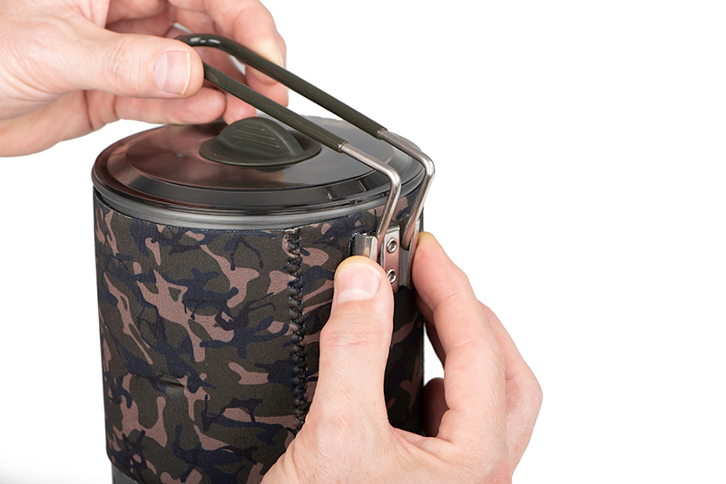Fox Cookware Infrared Power Boil este noul vas pentru gatit, special conceput pentru a utiliza eficient caldura oferita de aragazul Fox Infrared Stove. Este realizat din aluminiu anodizat si proiectat pentru fierberea apei sau pentru gatit. A fost proiectat cu un sistem de schimb termic incredibil de eficient pentru a minimiza consumul de gaz si reduce timpul necesar pentru gatit. Are maner pliabil care in timpul transportului fixeaza capacul. Capacul are orificii pentru evacuarea aburului care pot fi folosite pentru modelarea tubului termocontractabil pe monturi. Se livreaza cu husa din neopren cu finisaje Fox Camo ce poate fi utilizata chiar si cand vasul este folosit, imbunatatind izolarea termica. In acelasi timp husa are rolul sa mentina continutul vasului cald pentru o perioada indelungata. In interiorul vasului puteti depozita o butelia de gaz de 500gr sau aragazul.